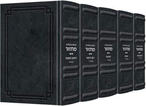 Artscroll Interlinear Machzorim Schottenstein Edition 5 Volume Set Signature Leather Collection Full Size Midnight Blue Leather Sefard
