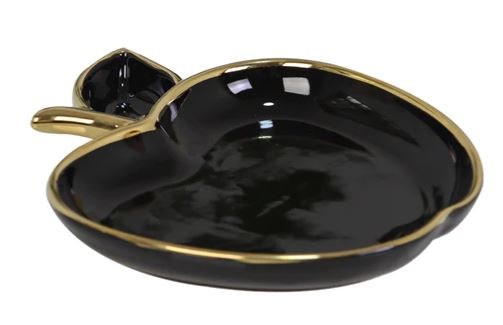 Ceramic Apple Shaped Dish Gold Trim Black 8"