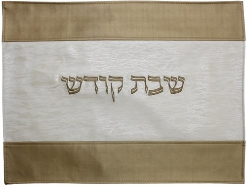 It is beautifully decorated with a classic texture and a middle runner, along with the words "Shabbos Kodesh" in Hebrew.