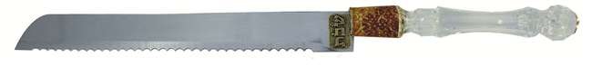 This challah knife has a sharp blade and will do its job well. The lucite handle with burned orange design adds class and elegance to the Shabbos table.