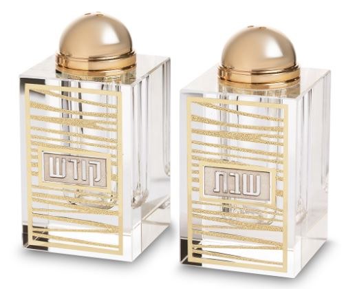 These crystal shakers are accented with a laser cut stripe design gold metal plate on the front featuring the Hebrew words "Shabbos" and "Kodesh". A gold dome sits on top for easy pouring.