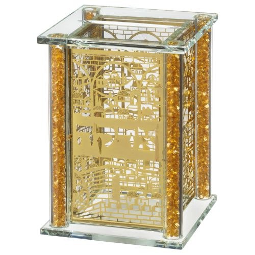 Magnificent crystal Tzedakah Charity Box with crushed glass filled stems on all four corners. Metal plate designed with Jerusalem buildings adorns all sides. Hebrew word "Tzedaka" is engraved in the center of each side. Silicone seal on bottom for easy coin removal.