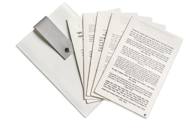 This elegant leather Womans card set is designed for the modern Jewish woman. Printed on high-quality faux leather, it includes five essential tefillos: Birchas Hashachar, Hafrashas Challah, Shema, Birchas Hamazon, and Al Hamichya.
