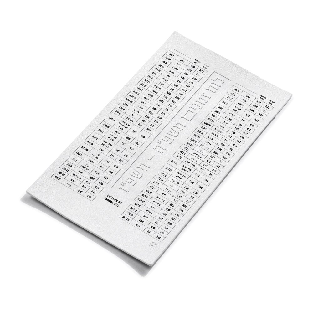 This gorgeous faux leather Zemanin Magnet is perfect to keep on your fridge! Candle Lighting times for Shabbos and Erev Yom Tov for the year 2025/5785-5786 in Brooklyn, NY.
