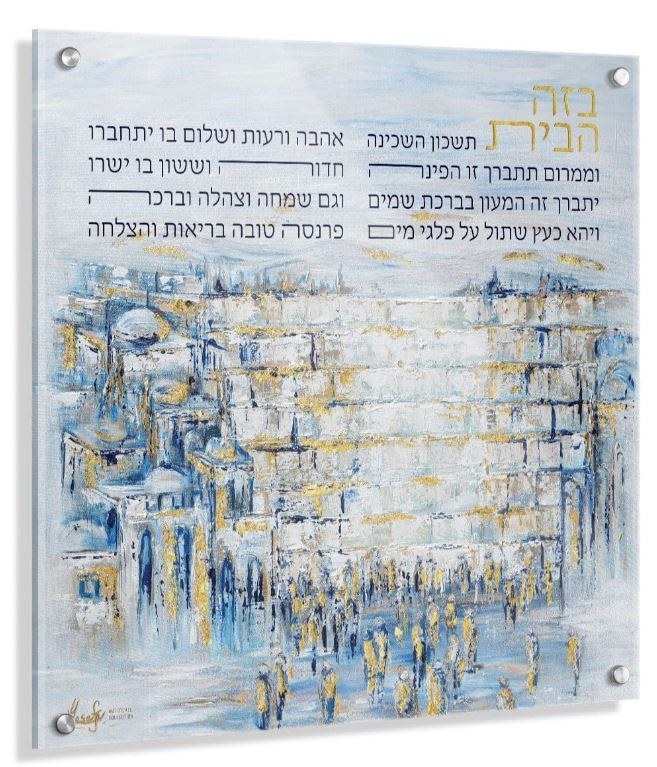 Introducing the Painted Birchas Habayis — an exquisite piece printed on crystal-clear lucite with a touch of blue for a nearly one-of-a-kind look. This beautiful Judaica wall art brings elegance and spiritual meaning to any home. Featuring the Birchas Habayis blessing, its vibrant design makes it a standout piece, and it pairs perfectly with other items in the same collection.
