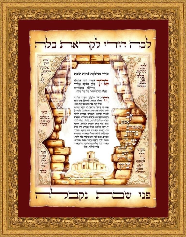Illuminated Hadlakas Neiros Candle lighting and Binyan Hamikdash on Parchment in Ornate Frame