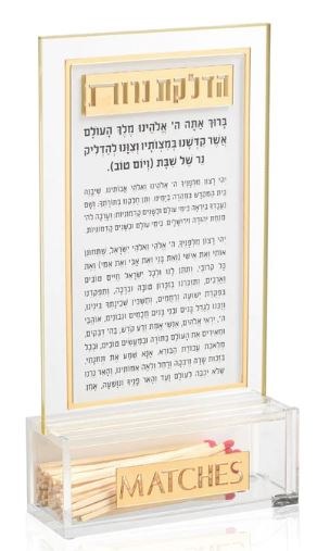 Enhance your Shabbos setup with the Classic 2.0 Hadlokas Neiros Match Cloche Card -a modern Judaica piece that’s as practical as it is beautiful. Featuring a classic 2.0 lucite candle lighting card with the Hadlokas Neiros bracha, it sits atop a clear lucite match cloche, keeping your matches handy and your space elevated. A sleek and stylish addition to your Shabbat candle lighting routine, perfect for gifting or everyday Shabbos décor.