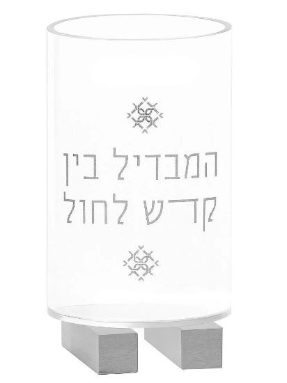 Elevate your Motzei Shabbos with the Inspired Havdalah Cup, featuring a crystal-clear lucite cylinder, sleek metallic base, and elegant gold or silver Hebrew lettering.