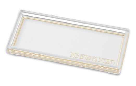 Elevate your Havdalah experience with this striking Havdalah Tray. Features clear lucite sides, white lucite bottom, gold line border on all the sides and bottom, and the Hebrew words "Hamavdil Bein Kodesh L'chol" in gold.