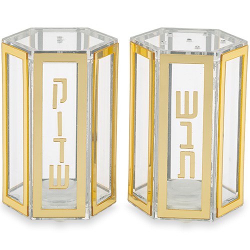 Hexagon shaped shakers with a gold line border on all sides. Features the Hebrew words "Shabbos" and "Kodesh" on the front.