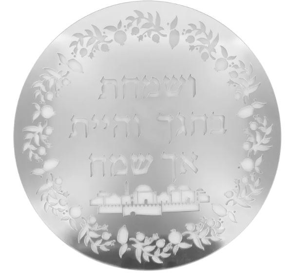 Laser cut Hebrew pasuk "V'samachta B'chagecha" is in the center surrounded by a border of laser cut pomegranates.