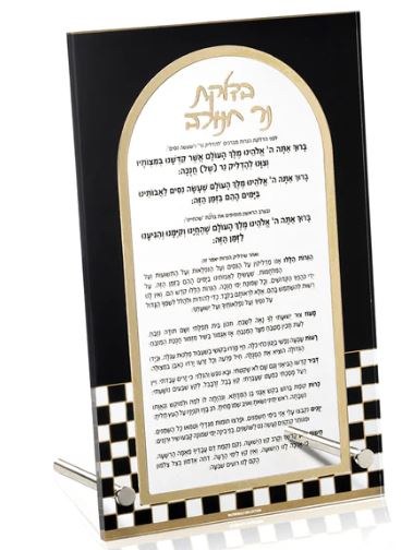 This beautiful exquisite Onyx Tabletop Chanukah Brachos is printed on crystal clear lucite with sophisticated black and white color scheme with gold accent & gold 3d mirrored details.