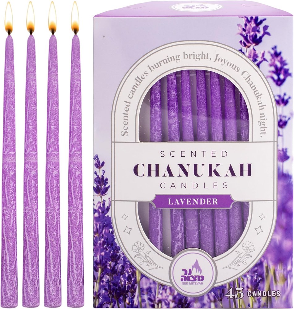 These candles meet all Jewish law requirements to be lit in a menorah, and at 5" tall are designed to burn for more than 1 hour, giving off a lavender scent.