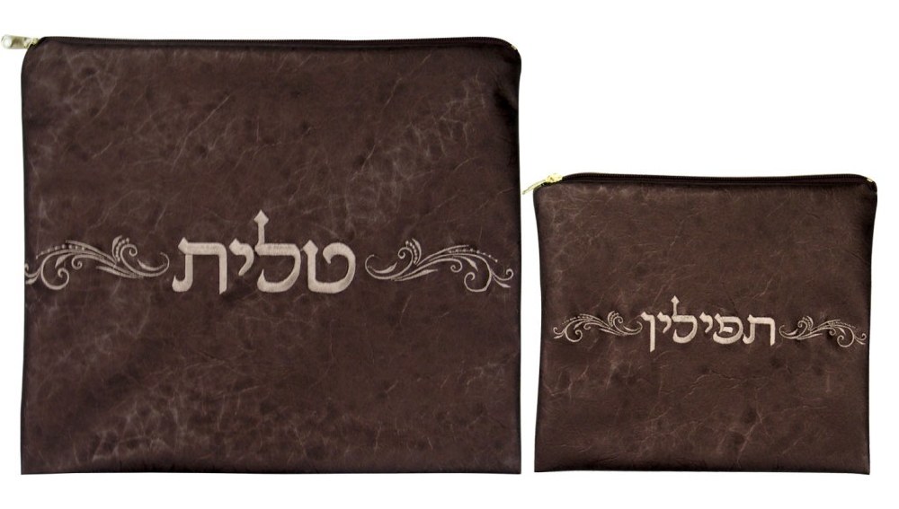 Tallis and Tefillin Bag Set Brown Leather Wrinkle Texture Design