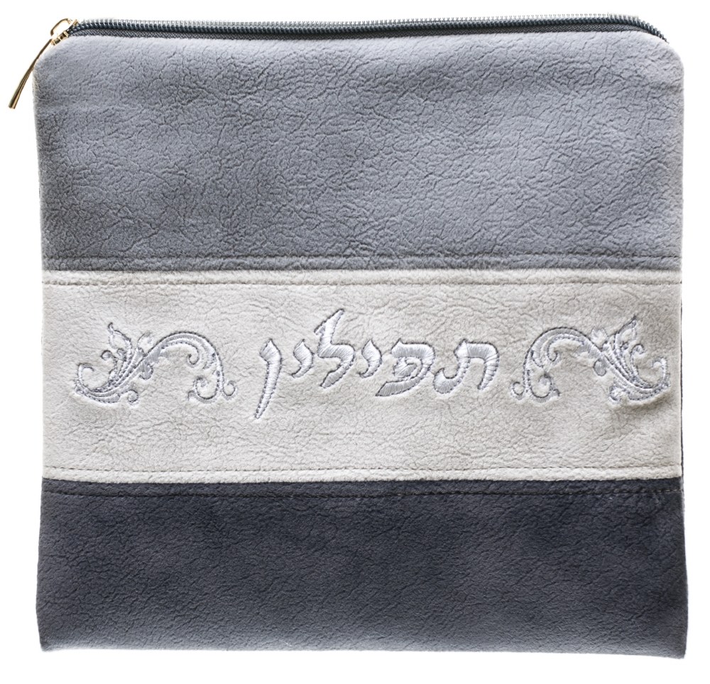 Tefillin Bag Faux Leather Grey, Light Grey and White Striped Design