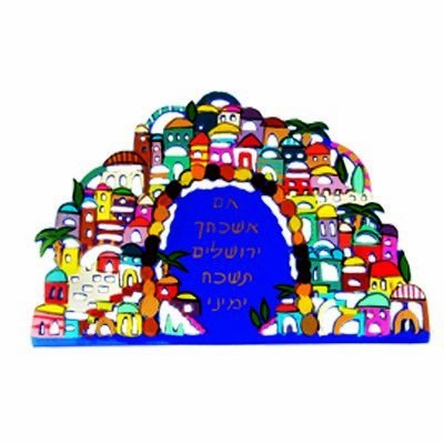 The design features the Jerusalem cityscape in its infinite variety and color, and includes a hole at the top with which to hang it on your wall. The center displays the ancient words of longing for Jerusalem "If I forget thee, O Jerusalem".