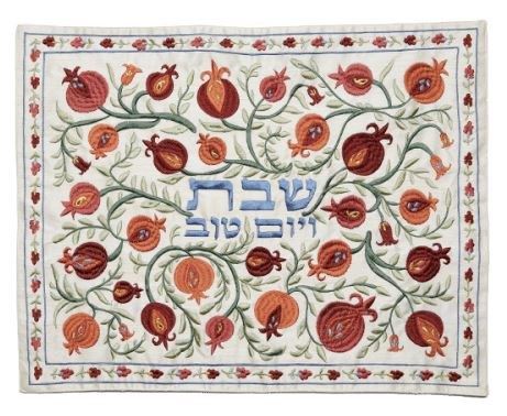 This challah cover is designed and produced by the Jerusalem artist Yair Emanuel. Pomegranates of different shapes, sizes and colors are embroidered on the challah cover. In Jewish tradition pomegranates are a symbol of blessing and abundance. The design was inspired by Suzani Persian embroidery. The material is a blend of cotton and polyester. In the center are the Hebrew words 'Shabbos V’Yom Tov'.