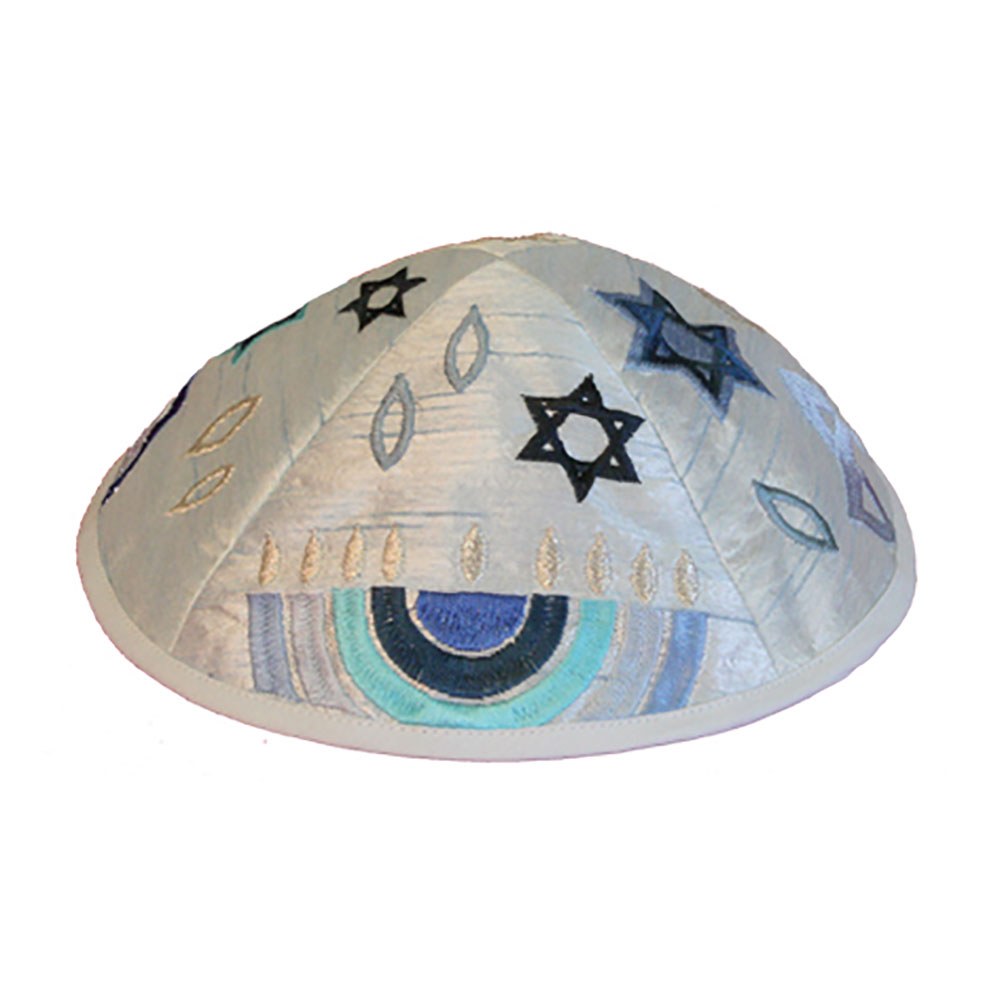 This soft, stylish kippa by Yair Emanuel is an attractive way to express your Judaism. This beautiful kippa is machine embroidered and features a menorah and the stars of David in shades of blue and grey.