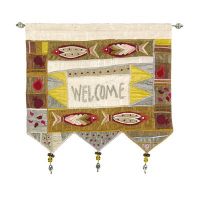 This decorative sign is a wonderful way to greet guest in your entryway. It is made of raw silk appliquéd embroidered onto the base creating a many-layered gold design. The appliquéd are geometrical patterns with friendly fish above and below the sign saying ?Welcome? in English The fringes are made from matching glass and metal beads. The mounting rod is made from brass pipe with brass finials.