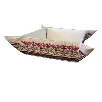 This gorgeous folding basket by Yait Emanuel is the perfect place to store challah or matzah. The basket is made of cream-colored raw silk and is then embroidered with multicolored thread. This folding basket is decorated on all sides.