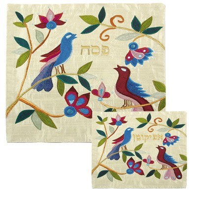 Yair Emanuel Raw Silk Matzah Cover and Afikoman Bag Set - Birds on White
