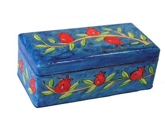 The design features the a beautiful illustration of lushes pomegranates on branches with leaves. Two Shabbat tea light candles fit perfectly in the box with a painted top slipping over them to keep them in place during travel. Once you get to your destination, just take the candles out and slide the top into a lower part of the box.