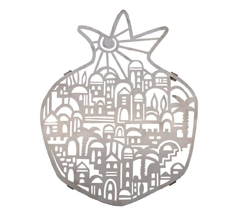 This piece features an elegant design of a Jerusalem landscape in a pomegranate shape. Made from laser cut stainless steel, this trivet has a sophisticated yet, soft look. What a wonderful way to serve your hot dishes!